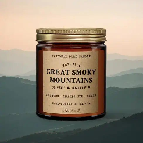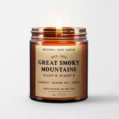 Get Your Great Smoky Mountains National Park Candle Add the heart of the mountains to your home with our Great Smoky Mountains National Park Candle. Inspired by the misty stillness of the Smokies themselves, this magical candle infuses your environment with crisp mountain air, rich forest greens, and just a smoky wood undertone. Turn your mind, body, and spirit towards that nostalgically warm adventure on the trail or around the campfire. Candle, whatever be your version of nature's embrace, bring a bit of it home with this blend distinct to the Great Smoky Mountains National Park Candle. Why You’ll Love It Made with a natural soy wax blend. Fragrance: Rich, multi-layered scent of smoky woods, pines, and mountain air Wax and cotton wick create a fresh, clean flame Gorgeous, simple glass jar — for plating at home Long burn time for continuing fireside enjoyment Eco-friendly and cruelty-free Care Instruction Trim the wick to 1/4 inch before you light your candle each time, and you’ll enjoy a cleaner, longer burn. Let the wax pool reach the edge of the glass on the first burn to avoid tunneling. Never leave burning candles unattended. Keep in a cool, dry place when not in use. About Great Smoky Mountains National Park This candle is inspired by the ethereal magic of the Great Smoky Mountains National Park, featuring the spirit of mist-kissed mountains, ancient forests, and rolling streams that breathe life into your home. The awe-inspiring scenery, the wild life that runs rampant, and the serene stillness of the land - it's all now captured in liquid form in this scent. Lighting this candle is akin to standing on top of Clingmans Dome, inhaling the infinite beauty of the great outdoors, a love letter to one of America’s most revered natural wonders.